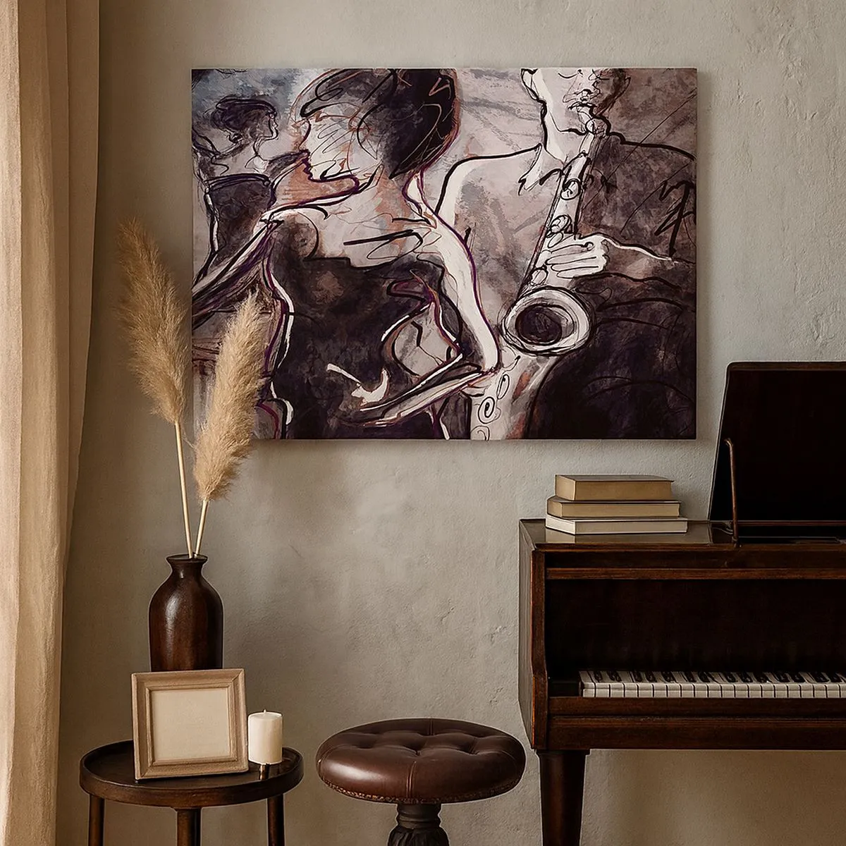 Canvastavlan "Jazzscen med saxofonist" är en unik komposition som kombinerar samtida konst med atmosfären av jazzmusik. Subtila linjer och dynamiska former avbildar saxofonisten och den dansande kvinnan, vilket skapar en atmosfär full av passion och uttryck. Färgerna är baserade på varma nyanser av brunt och lila, vilket ger elegans och djup till helheten.