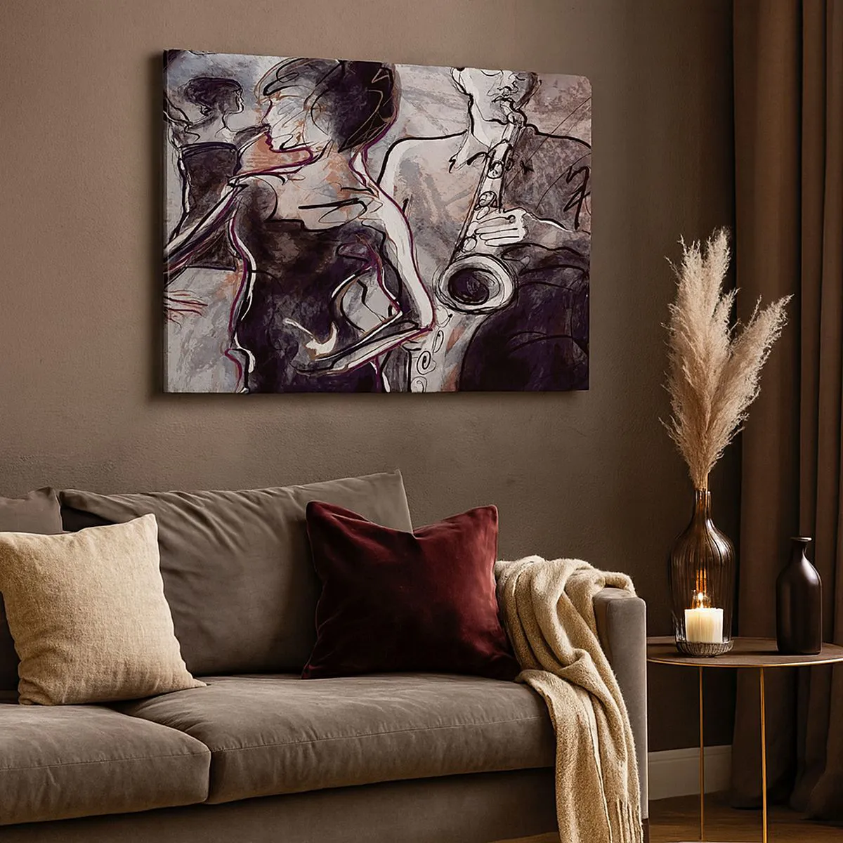 - Denna canvastavla på 70x50 cm avbildar en abstrakt jazzscen med en saxofonist och en dansande kvinna. Den är det perfekta tillskottet till inredningar inspirerade av musik och modern konst.
