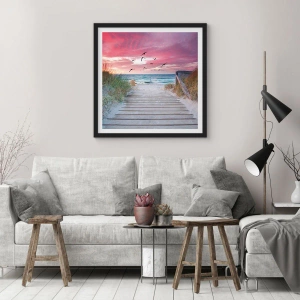 Affisch i svart ram - Trästig på stranden med utsikt över havet vid solnedgången - 50x70cm - Östersjöimpression - Modern väggdekoration för vardagsrum och sovrum ARTTOR