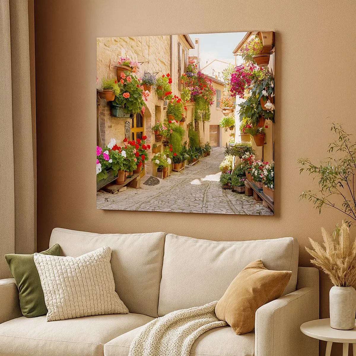 Canvastavlan "Gata med blommor och stenmurar" kombinerar kvalitet, skönhet och funktionalitet. Det är en dekoration som berikar alla interiörer och ger värme, harmoni och unik karaktär.