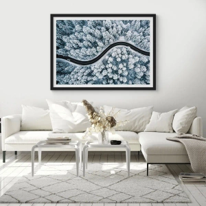 Affisch i svart ram - En pittoresk väg bland snötäckta träd från ett fågelperspektiv - 50x70cm - Genom vinterskogen - Modern väggdekoration för vardagsrum och sovrum ARTTOR