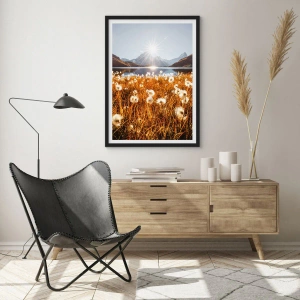 Affisch i svart ram - En äng med vita blommor mot en sjö och berg vid solnedgången - 50x70cm - Bergets hårdhet, gräsets mjukhet - Modern väggdekoration för vardagsrum och sovrum ARTTOR
