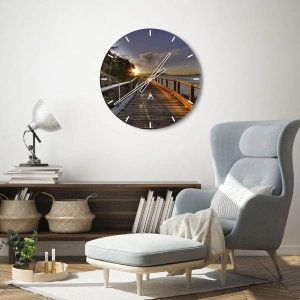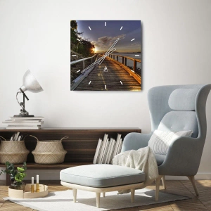 Väggklocka - Klocka på glas - En brygga över vattnet vid solnedgången - 30x30cm - Gå, fortsätt gå mot solen - Modern väggdekoration för vardagsrum, kök och sovrum ARTTOR