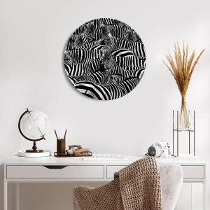 Urtavlan avbildar en dynamisk flock zebror, visade i ett karakteristiskt svartvitt mönster. Denna unika komposition gläds med sin symmetri, kontrast och exotiska atmosfär, vilket ger extraordinär harmoni och inspiration till interiören.