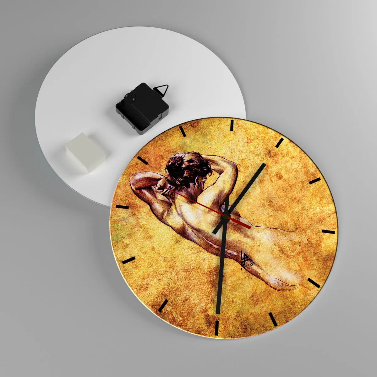 Klockans mekanism rör sig smidigt, vilket eliminerar irriterande tickande och säkerställer tyst drift, perfekt för interiörer som kräver lugn och ro, såsom ett sovrum eller arbetsrum. Den guldfärgade bakgrunden i kombination med det konstnärliga motivet skapar en komposition som ger värme och elegans till rummet, samtidigt som den betonar ägarens unika smak.