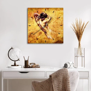 - Det konstnärliga motivet av en kvinnlig silhuett mot en gyllene bakgrund skapar en unik dekorativ komposition. Denna runda klocka utmärker sig genom sin elegans och subtilitet, perfekt för interiörer som vardagsrum, sovrum eller kontor.