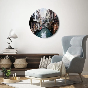 - Väggklockan avbildar en pittoresk venetiansk kanal med en gondol som flyter mellan historiska byggnader. Arkitekturen, broarna och det lugna vattnet skapar en charmig miljö som är perfekt för romantiska inredningar.