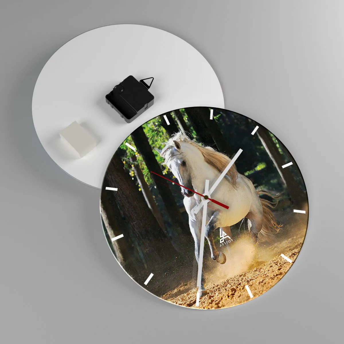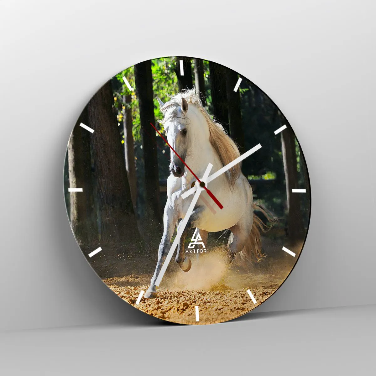 Väggklocka - Klocka på glas - En vit häst galopperar genom träden - 30x30cm - Som från en fantasybok - Modern väggdekoration för vardagsrum, kök och sovrum ARTTOR