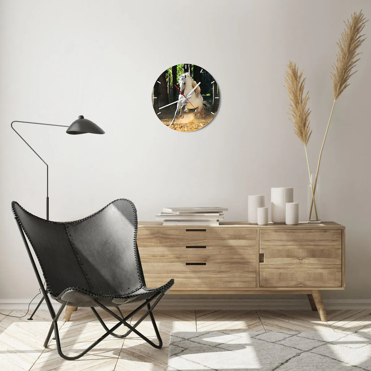 - Denna väggklocka föreställer en vit häst som galopperar genom träden. Dess eleganta och dynamiska design passar perfekt för inredningar inspirerade av naturen och harmoni.