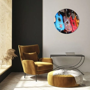 Väggklocka - Klocka på glas - Färgglada gitarrer i olika nyanser på en mörk bakgrund - 30x30cm - Latino klimat - Modern väggdekoration för vardagsrum, kök och sovrum ARTTOR