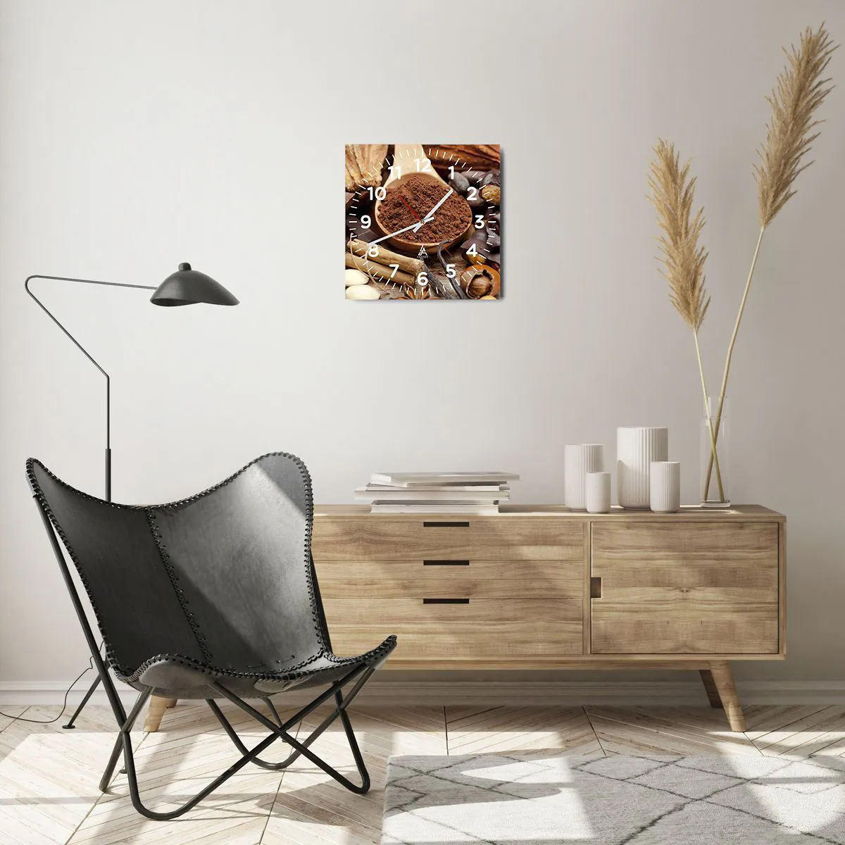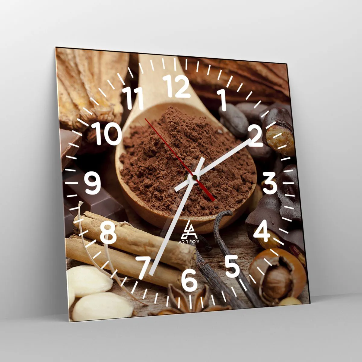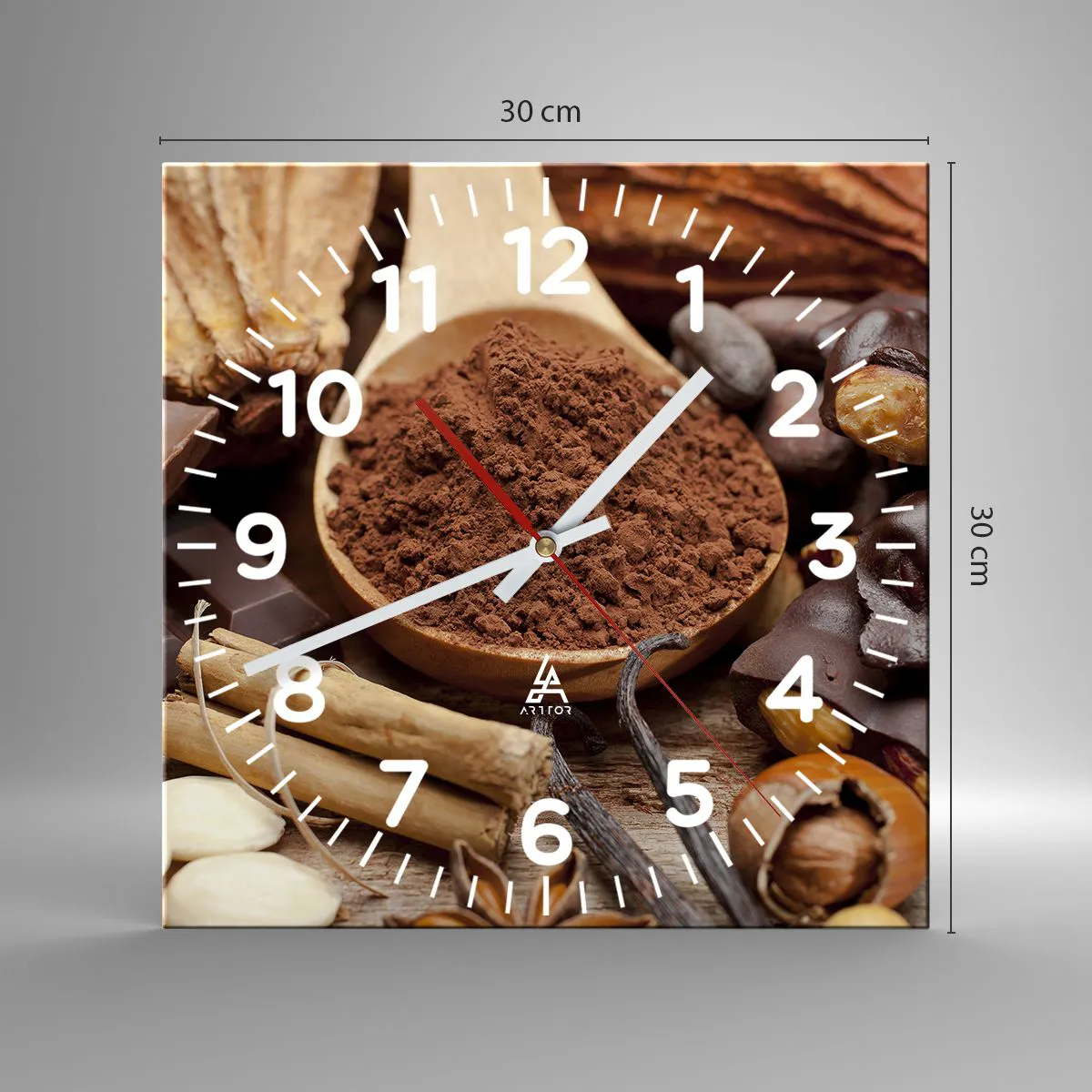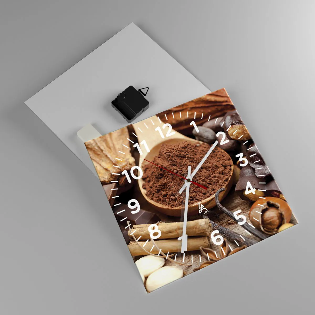 Klockan är utförd med den nyaste utskriftstekniken som garanterar bibehållande av naturliga färger och en hög färgmättnad. Tillverkning av klockor på glas sker i flera etapper. Den högkvalitativa utskriften och de två skyddsskikten genomgår en process för termisk sammanfogning med glaset. För detta använder vi en innovativ teknik som omfattar ugnar för glaslaminering i vakuummiljö.