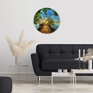 Väggklocka - Klocka på glas - Solnedgång vid vatten - 40x40 cm