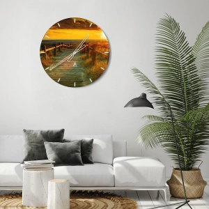Väggklockan "Badad i gammalt guld" är ett unikt dekorativt element som ger en lugn och romantisk atmosfär till interiören. Bilden visar en trästig som leder till stranden, badad i de varma färgerna från den nedgående solen. Solens strålar skapar en magisk aura som lockar ögat och har en lugnande effekt.