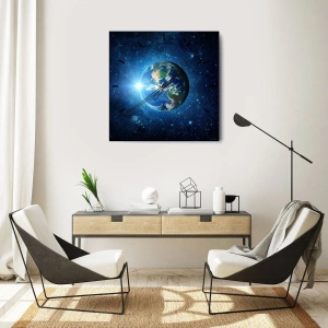 Den realistiska representationen av jordklotet och intensiva nyanser av blått och vitt skapar en harmonisk och elegant komposition.