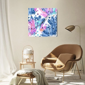 Väggklocka - Klocka på glas - Färgglada fjädrar i akvarellstil - 30x30cm - Fjädrar i vitt och blått - Modern väggdekoration för vardagsrum, kök och sovrum ARTTOR