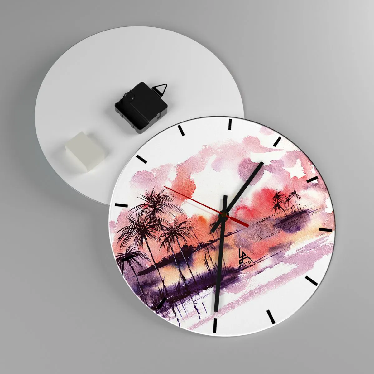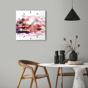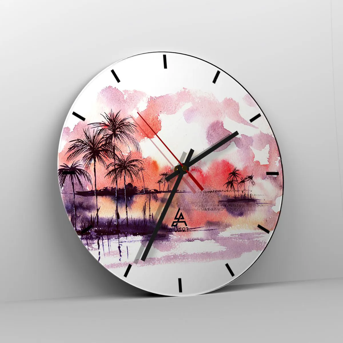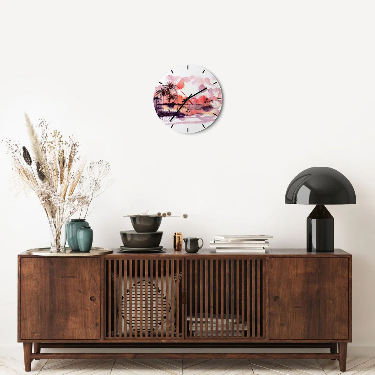 - Denna väggklocka har ett akvarellmotiv av palmer i solnedgången. Varma nyanser av rosa och lila skapar en harmonisk komposition, perfekt för eleganta inredningar.
