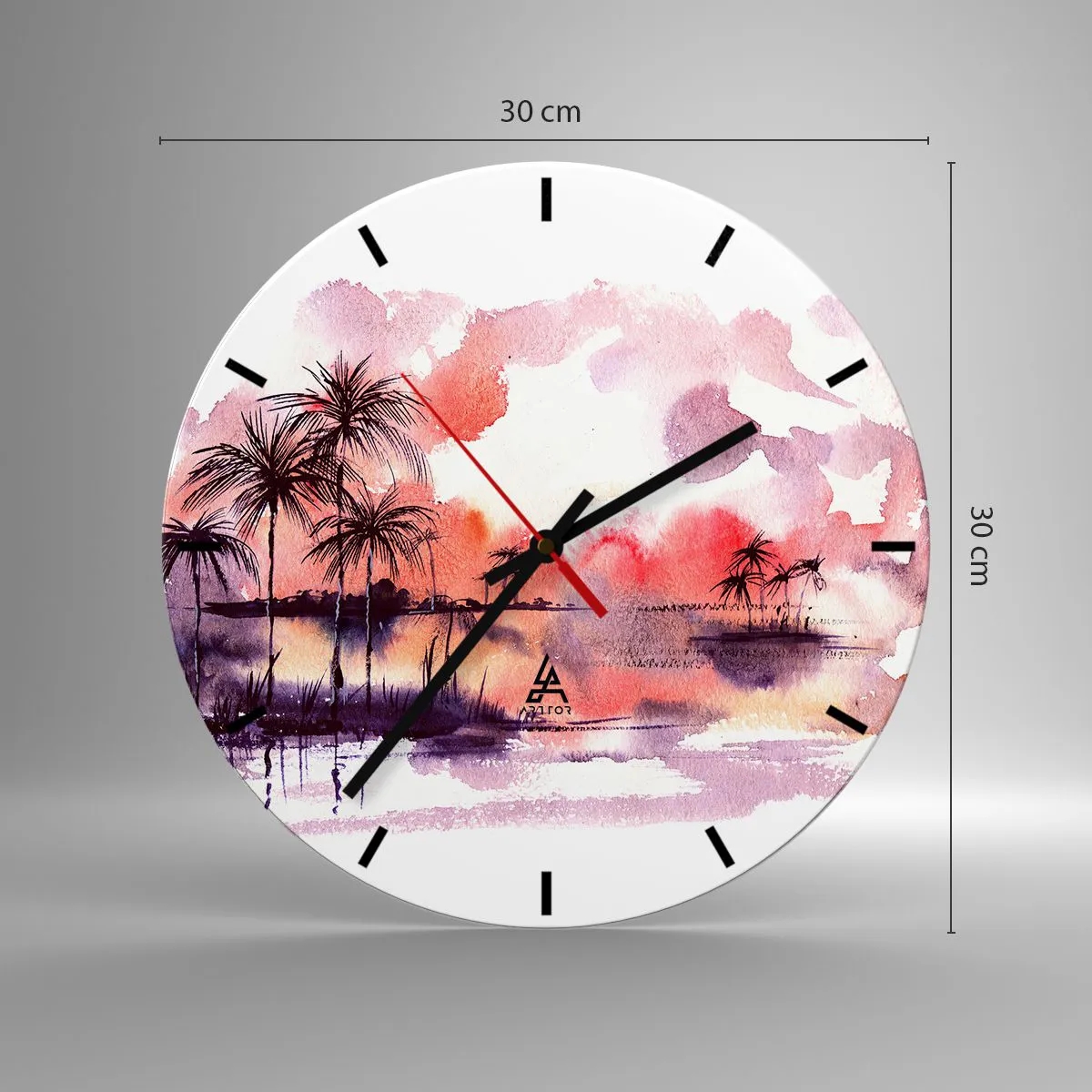 Väggklocka - Klocka på glas - Akvarelllandskap med palmer vid solnedgången - 30x30cm - Tropikens ro i rött - Modern väggdekoration för vardagsrum, kök och sovrum ARTTOR