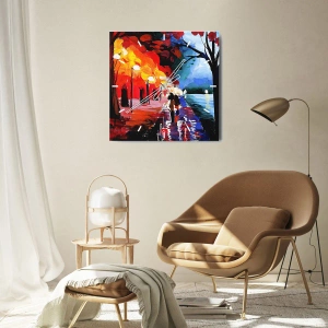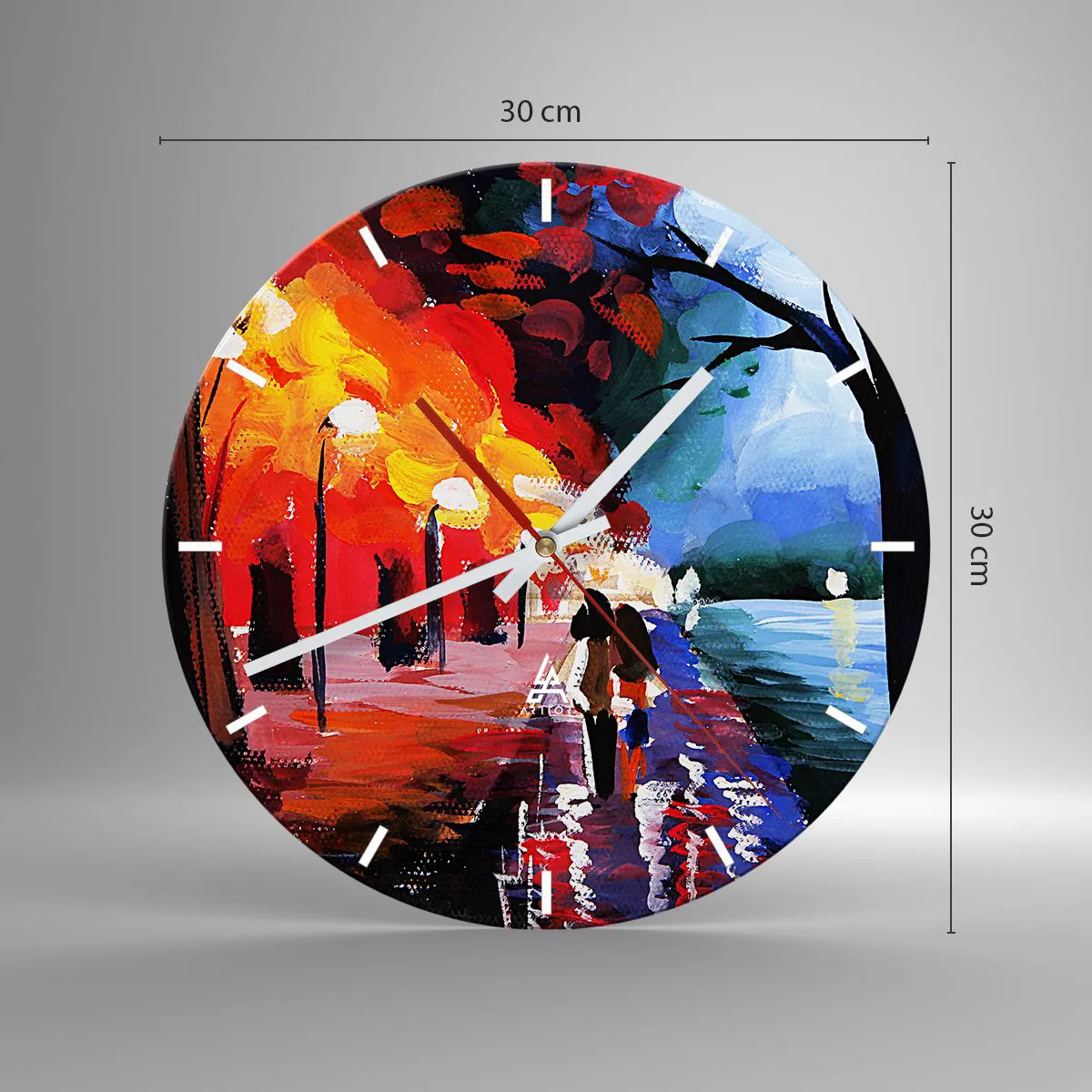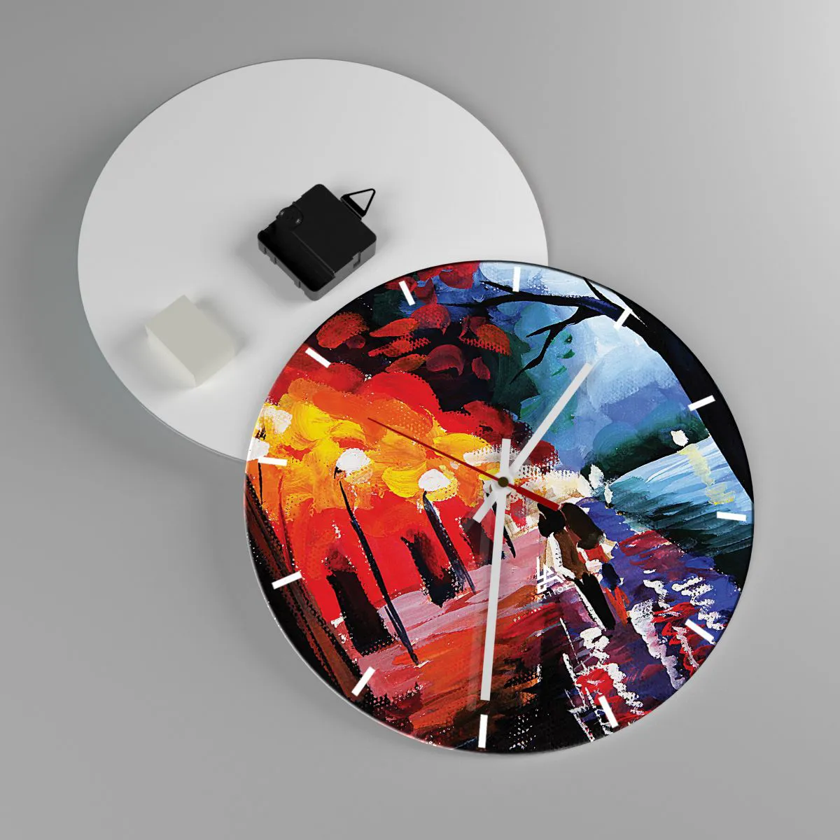 Väggklocka - Klocka på glas - Ett färgstarkt landskap med ett par som går i ljuset från en gatlykta. - 30x30cm - Brinnande höst i parken - Modern väggdekoration för vardagsrum, kök och sovrum ARTTOR