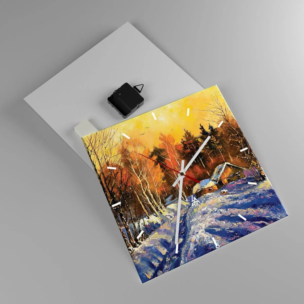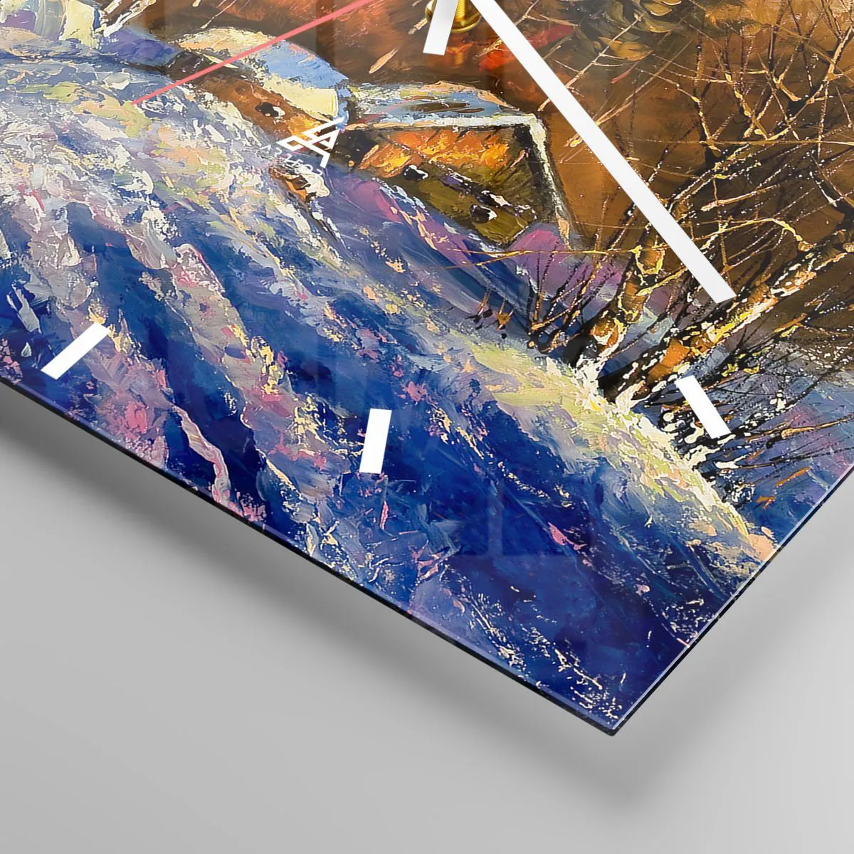 Klockan är utförd med den nyaste utskriftstekniken som garanterar bibehållande av naturliga färger och en hög färgmättnad. Tillverkning av klockor på glas sker i flera etapper. Den högkvalitativa utskriften och de två skyddsskikten genomgår en process för termisk sammanfogning med glaset. För detta använder vi en innovativ teknik som omfattar ugnar för glaslaminering i vakuummiljö.