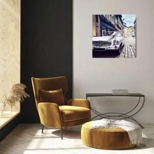 Väggklocka - Klocka på glas - En klassisk bil på en kullerstensgata omgiven av hyreshus - 30x30cm - Det förflutna är idag - Modern väggdekoration för vardagsrum, kök och sovrum ARTTOR