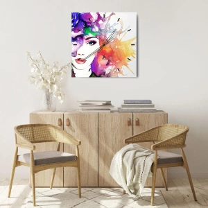 Väggklocka - Klocka på glas - Abstrakt kvinnas ansikte omgivet av färgglada fläckar - 30x30cm - Med huvudet i himlen - Modern väggdekoration för vardagsrum, kök och sovrum ARTTOR