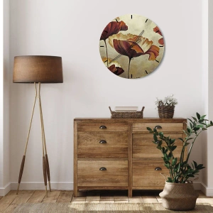 - En väggklocka med ett konstnärligt blommotiv i bruna och beige toner. Dess eleganta design ger harmoni och en subtil atmosfär till alla interiörer.