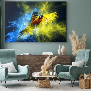 Canvastavla - Bild på duk - En papegoja i flykt mot en bakgrund av färgglada explosioner av gult och blått. - 70x50cm - I blå-gult damm - Modern väggdekoration för vardagsrum och sovrum ARTTOR