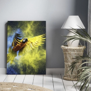 Väggkonst - I blått och guldstoft - En papegoja i flykt mot en färgglad explosion av gult och blått