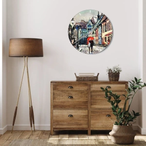 "Regn för två" är en konstnärlig väggklocka som avbildar en romantisk gata med ett paraply mot en bakgrund av pittoreska hyreshus i en regnig miljö. Detta unika motiv introducerar en atmosfär av elegans och nostalgi i interiören, samtidigt som det fungerar som ett distinkt dekorativt element.