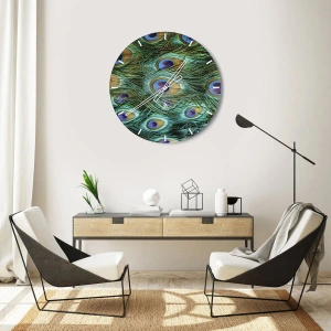 Väggklocka - Klocka på glas - Påfågelfjädrar i gröna och blå nyanser - 30x30cm - Påfågels blick - Modern väggdekoration för vardagsrum, kök och sovrum ARTTOR