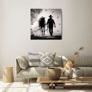 Väggklocka - Klocka på glas - En cowboy som leder sin häst i morgondimman - 30x30cm - En morgon i Texas - Modern väggdekoration för vardagsrum, kök och sovrum ARTTOR