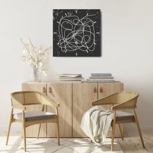 Väggklocka - Klocka på glas - Uttrycksfull abstraktion med ljusa linjer på svart bakgrund - 30x30cm - Vilsegångna tankar - Modern väggdekoration för vardagsrum, kök och sovrum ARTTOR