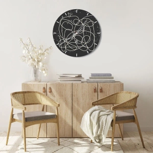 Väggklocka "Vandrande Tankar" är en konstnärlig abstraktion baserad på uttrycksfulla, slingrande linjer på en djup, svart bakgrund. De ljusa konturerna skapar ett dynamiskt mönster som för tankarna till en oordnad ström av tankar eller känslor.