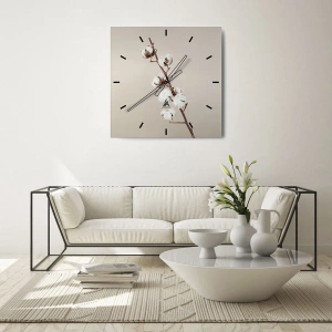 Väggklocka - Klocka på glas - En kvist bomull på en beige bakgrund i minimalistisk stil - 30x30cm - Hos mjukhetens källa - Modern väggdekoration för vardagsrum, kök och sovrum ARTTOR