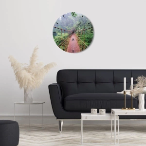 - Denna väggklocka har en röd hängbro som hänger över en dimmig tropisk djungel. Den är den perfekta dekorationen för inredningar med resetema, exotisk inredning eller en modern känsla, och framkallar en känsla av äventyr.