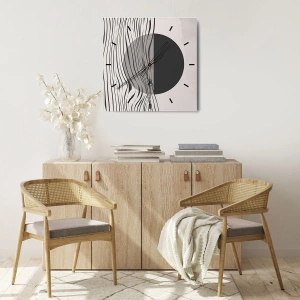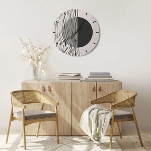 - En rund väggklocka med abstrakta vågiga linjer och en geometrisk cirkel. Dess moderna svartvita design kompletterar minimalistiska och eleganta inredningar perfekt. Klockan är tillverkad av 30x30 cm glas.