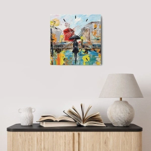 - En rund väggklocka med en målad stadsbild som föreställer en kvinna med ett paraply framför en väderkvarn. Den fångar den färgstarka, romantiska atmosfären i Paris. Verket är tillverkat på glas och mäter 30x30 cm.