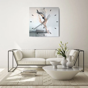 Klockan är tillverkad av glas med 4mm tjocklek. Klockans utförandeteknik överensstämmer med säkerhetsklassen 2B2 enligt standarden PN-EN 12600:2004 vilket garanterar slagtålighet. Klocka på glas är klar för upphängning - är försedd med metallögla fastsatt på klockans baksida samt en distans av skum som justerar avståndet mellan klockan och väggen. Klockan har en tyst steglös mekanism som strömförsörjs med 1,5V AA batteri (batteriet ingår inte).