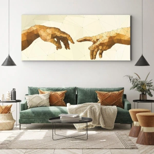 Gudomlig geometri är en målning som kombinerar samtida konst med ett klassiskt motiv som symboliserar koppling och harmoni. Geometriska händer, som sträcker ut handen mot varandra på en ljus bakgrund, skapar en enkel men otroligt uttrycksfull komposition. Den minimalistiska stilen och de subtila linjerna ger verket en modern karaktär som smälter perfekt in i en mängd olika inredningsstilar.