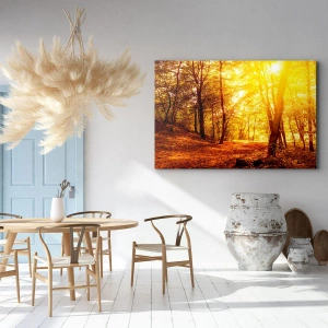 - En målning som föreställer en höstglänta med en skogsstig i gyllene solljus. En stämningsfull och pittoresk komposition som för in naturens harmoni och skönhet i interiören.
