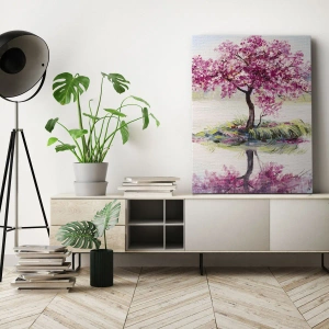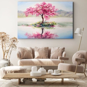 Blommande träd på lugnt vatten är också en perfekt presentidé för natur- och konstälskare. Detta konstverk inspirerar, skapar lugn och harmoni och betonar den unika karaktären hos alla interiörer.