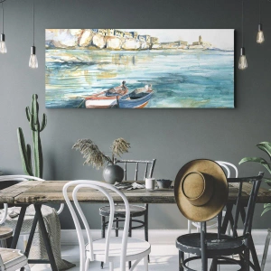 Landskap i Azure är en unik målning på duk som mäter 70x50 cm, som avbildar ett pittoreskt havslandskap. Två båtar flyter på lugnt, turkost vatten, vilket återspeglar pastellfärgerna på himlen och kusten. Charmiga byggnader kan ses i bakgrunden och kompletterar atmosfären av lugn och harmoni.