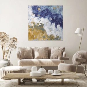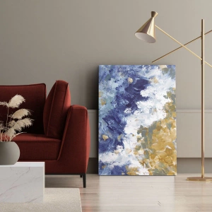 Abstrakta kompositioner som denna blir alltmer populära inom inredning. Deras förmåga att kombinera estetik med funktionalitet gör dem till ett idealiskt val för dem som vill skapa harmoni och lugn i sin omgivning. Tryckets färger – blått, vitt och guld – symboliserar lyx, fräschör och kreativitet.