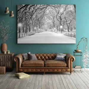 Väggkonst - Fyra årstider - Vinter - Vintergränd med snötäckta träd i en monokrom bild