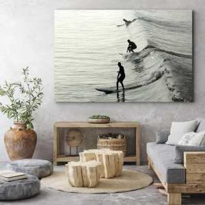 Canvastavla "Möte vågen" är en dynamisk komposition som fångar ett ögonblick av rörelse och energi. Den avbildar surfare som rider på vågorna, fördjupade i samspelet mellan natur och adrenalin. Den monokroma bilden ger en tidlös stil till helheten och framhäver både vågornas detaljer och surfarnas silhuetter.