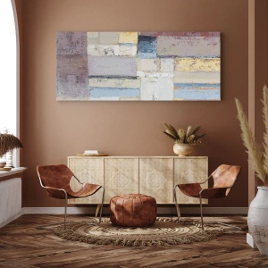 Canvastavla "Geometrins fred" är en unik abstrakt komposition som kombinerar modern minimalism med pastellfärgernas delikatess. Geometriska arrangemang av rektanglar och linjer skapar en harmonisk helhet som ger lugn och elegans till interiören. Detta verk lockar ögat med sina proportioner och subtilitet.