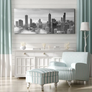 Väggkonst - Amerikanskt landskap - Stadspanorama med skyskrapor i molnen i svartvitt