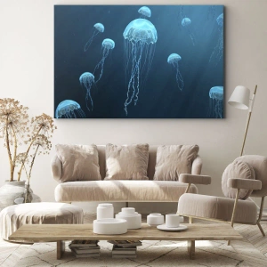 Canvastavla "Ocean Dance" är en unik komposition som transporterar betraktaren till havets djups magiska värld. Den avbildar maneter som flyter i vattnet i en delikat dans, omgivna av havets lugn. Rörelsens harmoni och färgernas subtilitet skapar en bild full av lugn och inspiration, som gläds med sin estetik.