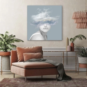 Canvastavla - Bild på duk - Porträtt av en kvinna med ansiktet dolt bakom moln och vågor - 70x50cm - Med huvudet i molnen - Modern väggdekoration för vardagsrum och sovrum ARTTOR