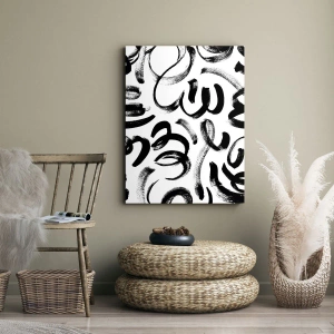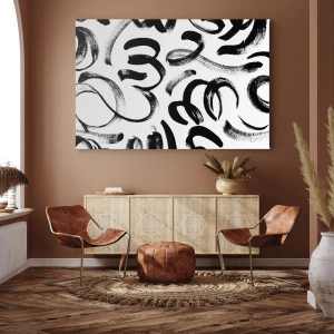 Den 70x50 cm horisontella canvastavlan "Svart på vitt" är ett verk med exceptionellt uttrycksfull karaktär. Kompositionen av svarta, dynamiska penseldrag på en vit bakgrund skapar en originell visuell effekt som drar till sig uppmärksamhet och ger interiören en unik stil.
